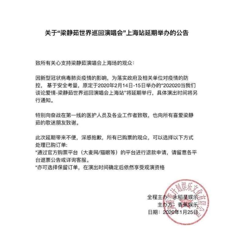 因受到新型冠状病毒的影响,也为了响应政府防控的号召,一系列在疫情高发期举行的演唱会悉数宣布取消。