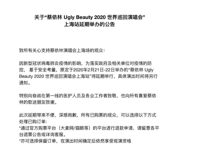今日,蔡依林也发布公告,宣布2月21日、22日在上海举行的“Ugly Beauty”演唱会将延期举行,具体演出时间另行通知。