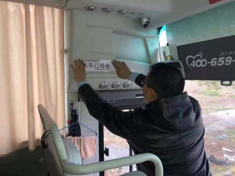 驾驶员王师傅则在车辆后排座位旁给车辆换上干净、整洁的白座套。完成一整套消毒清洁工作后,他俩还一起给车辆张贴“本车已消毒”的标贴。