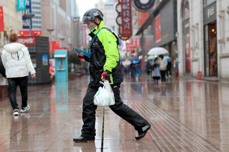鼠年大年初一,雨水不断,许多市民过年不串门,选择宅在家里过大年。寒风瑟瑟的街上,外卖小哥们仍冒雨穿行为市民递送有温度的美食和生活物品。