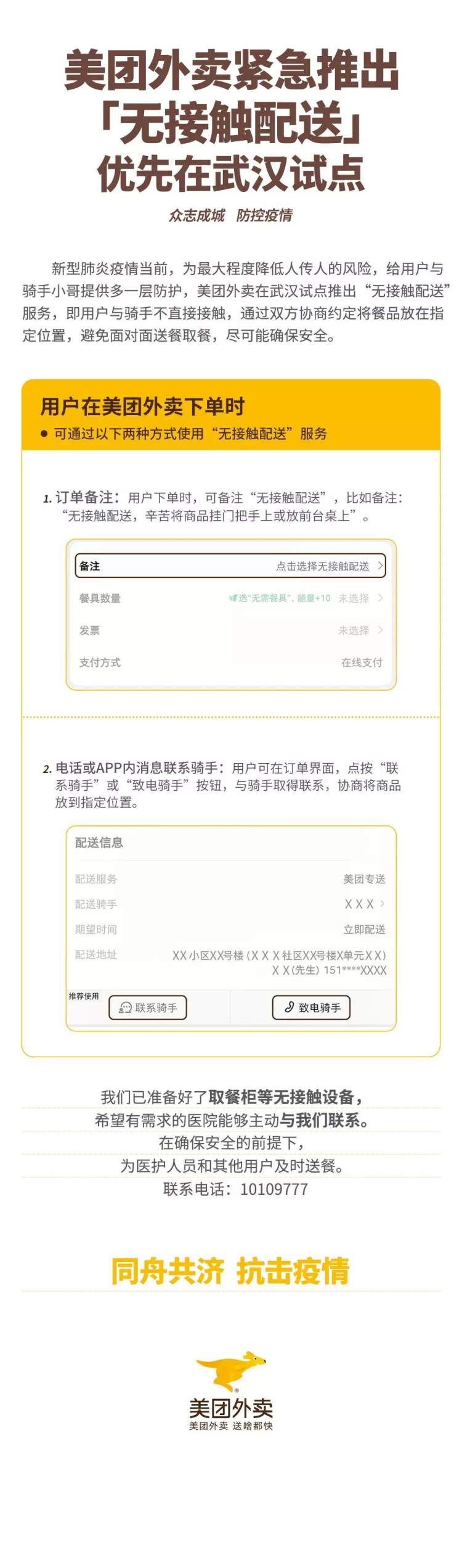 此外,针对医院地区的送餐,已准备好了取餐柜等无接触设备,希望有需求的医院能够主动与美团外卖联系。联系电话:10109777