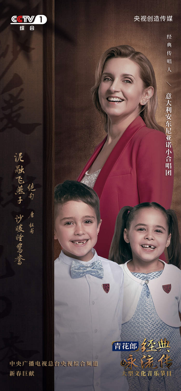 每年新年演出“一票难求”的小安团——意大利安东尼亚诺小合唱团此次也惊喜亮相,他们将围绕诗圣杜甫的《绝句》,将“泥融飞燕子,沙暖睡鸳鸯”的意境融入歌曲《花儿朵朵》,带领观众体会春天的美好。