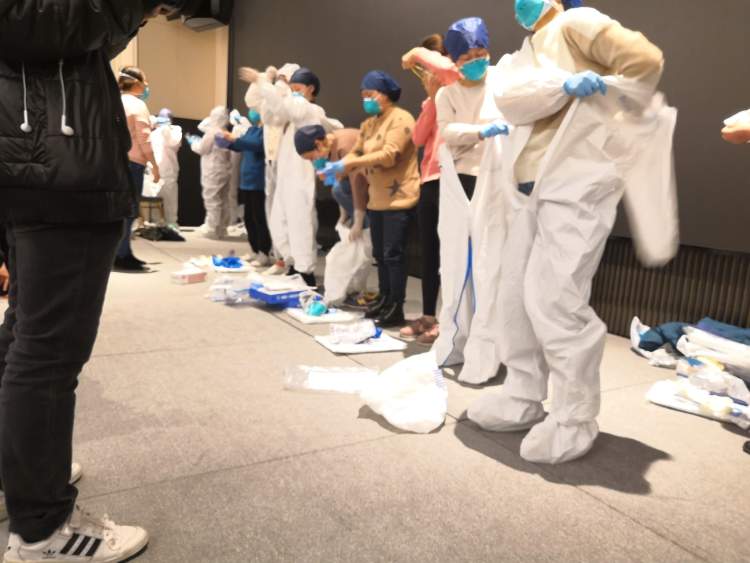 13:00 我们得知今天起我们将接手北2层楼和北3层楼,都是基本规范的传染病建制病房,2层是普通病房,收治确诊患者;3层收治重症患者,简易监护室病房,配备无创呼吸机,防护措施基本到位,但后期供应可能会有困难,现场氛围再一次凝重。