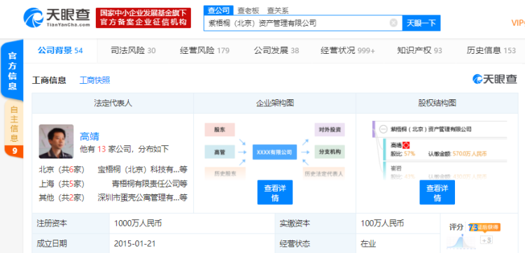 据天眼查,蛋壳公寓的运营主体为紫梧桐(北京)资产管理有限公司,成立时间为2015年1月,注册资本为1000万元人民币,法定代表人为CEO高靖,亦为该公司最终受益人之一,持股比例为57%,二股东为崔岩,持股比例为43%(见上图)。
