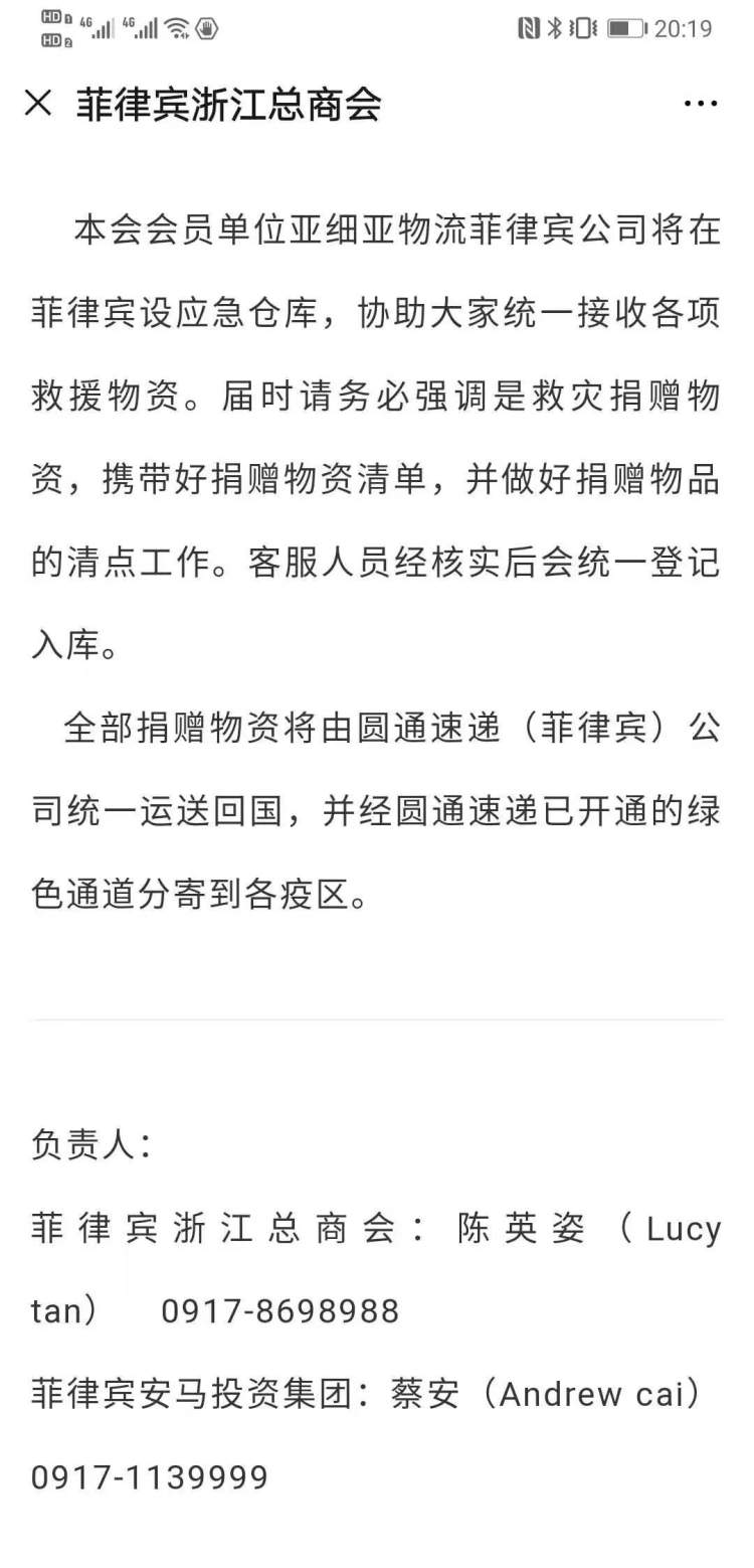菲律宾浙江总商会宣布,携手会员单位圆通速递(菲律宾)公司、菲律宾安马投资集团为侨胞慈善义捐提供积极协助,开通救援物资运输绿色通道,为在菲各大组织、机构及个人提供救援物资免费运输,支持祖国早日战胜疫情。