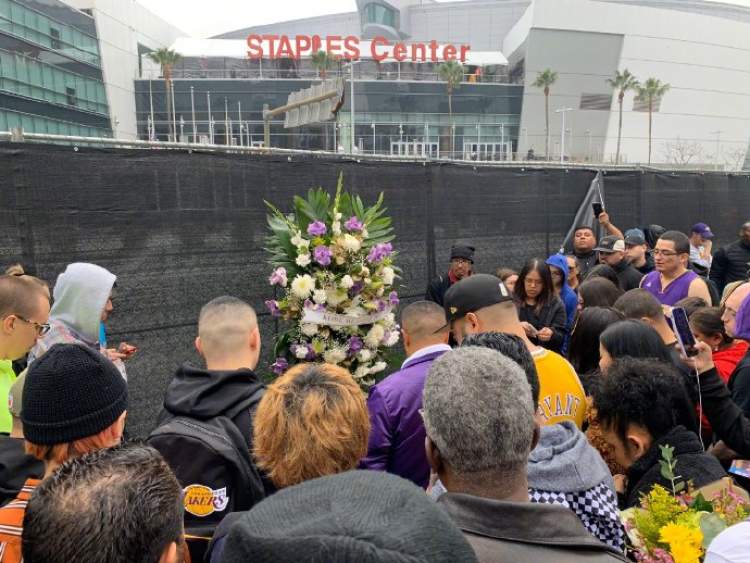 湖人队主场斯台普斯中心外,球迷们自发地聚集在了一起,临时组织起一个场所,自发悼念科比。
