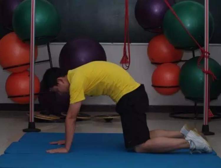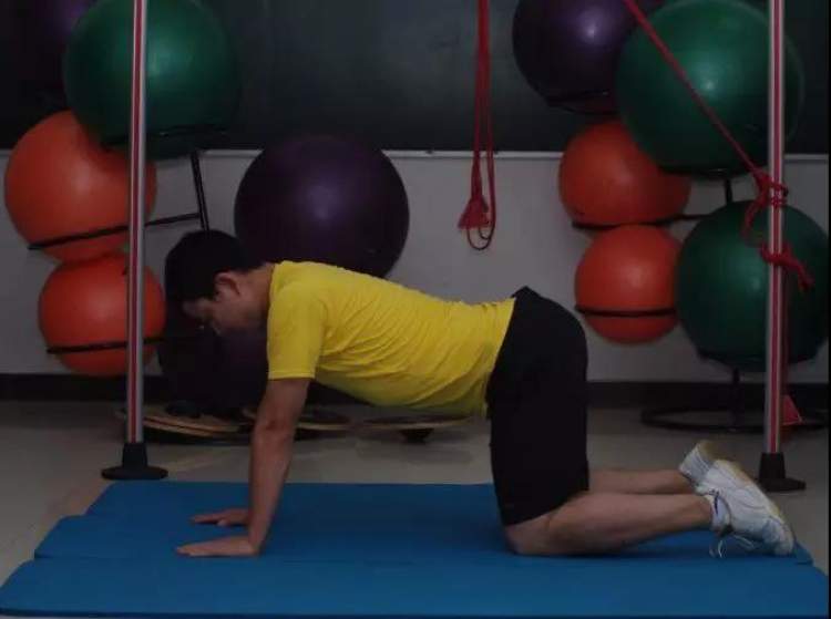 身体爬于垫面,保持好肢体四个90°(即大腿与小腿之间90°、大腿与躯干90°、躯干与大臂90°、手臂与地面90°),在初始阶段尽可能放松。