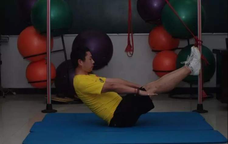 肢体以臀部为支点呈倒三角形坐于垫面,双手自然放于身体两侧。尽力伸直自己的双腿,并且合并在一起。
