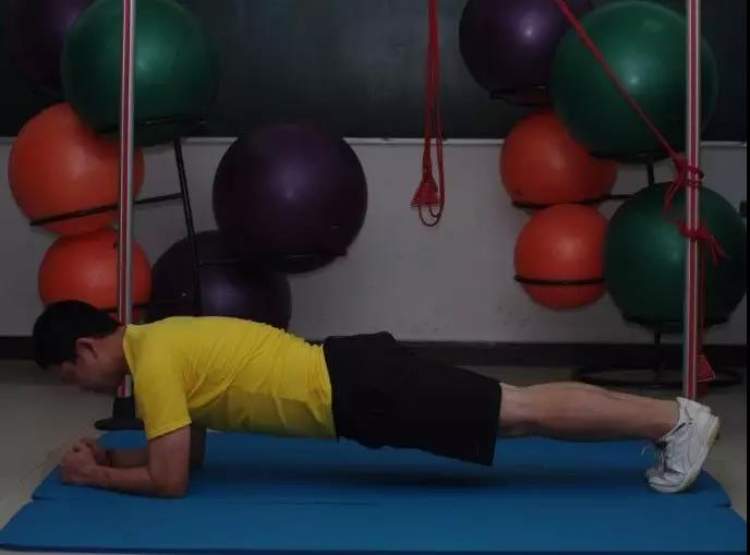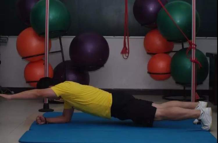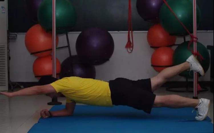 单侧肘关节支撑于垫面,确保良好基本姿态的保持,抬头挺胸。同样,在进行动作时要求髋关节向身体的前侧微微倾斜,保持良好的身体形态。