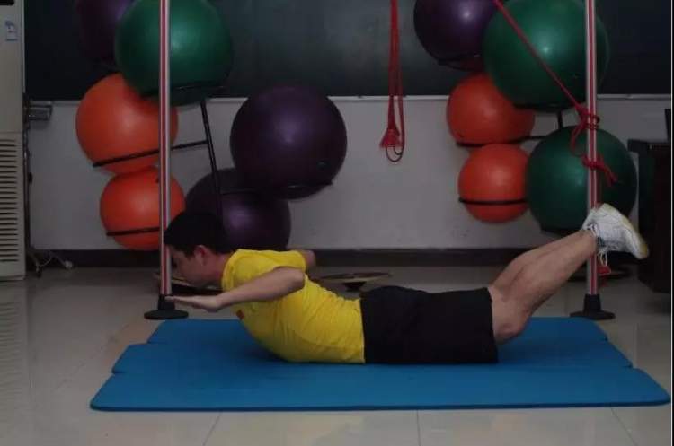 俯身爬于垫面,躯干、大腿面尽自己最大努力向上抬起,两侧手臂自然放于身体两侧,躯干背部、臀部肌肉尽力收缩,两侧大腿、脚后跟尽力合并在一起,两脚尖向外打开。