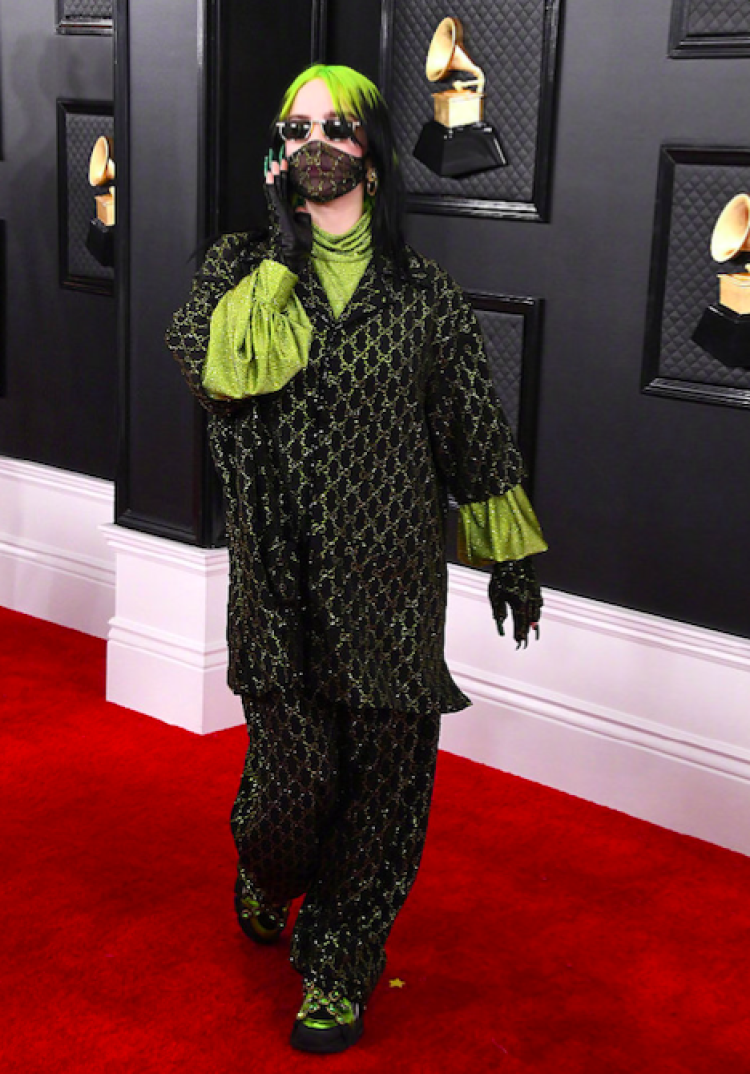 碧梨(Billie Eilish)以一身荧光绿+黑色穿搭亮相红毯,搭配同款色系的发型配上纱质面罩。