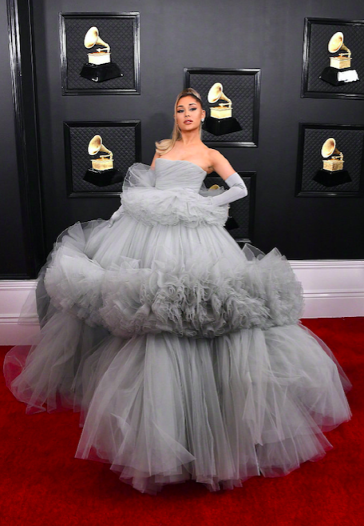 而在此前的红毯上,A妹(Ariana Grande)身着一袭灰色超大裙摆纱裙配以高马尾。