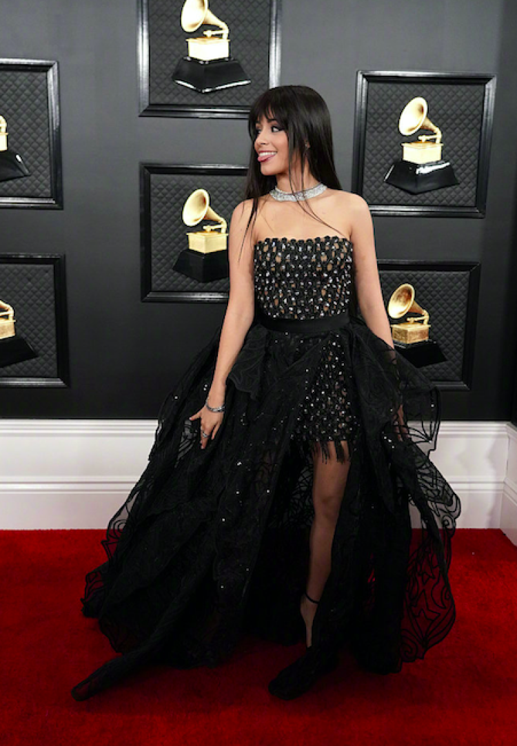 卡妹(Camila Cabello)网格露肩裙亮相,又酷又甜。