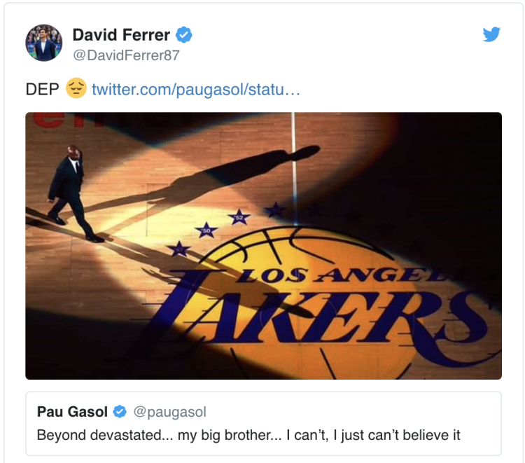 德约则写道:我对这个新闻深感哀悼,科比是我的良师益友。你和你的女儿将永远活在我们心中。对于布莱恩特一家和遭受这场悲剧的家庭,没有足够的言语来表达我最深切的同情。愿我的朋友安息。