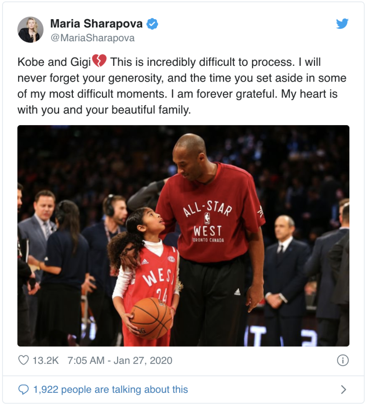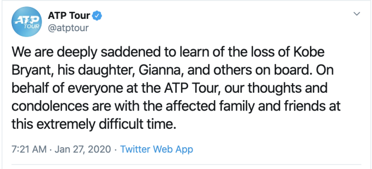 ATP官方表示,听闻科比·布莱恩特和他的女儿Gianna,以及同机其他人失事,深感悲痛。在这个极其困难的时刻,谨代表巡回赛每位参与者,向受此影响的家人和朋友表示慰问。