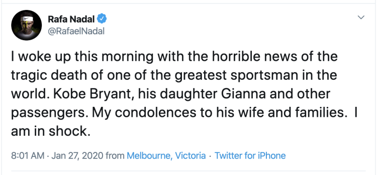 纳达尔在社交媒体上写道:一早醒来,我被世界上最伟大的运动员之一不幸去世的坏消息震惊——科比·布莱恩特、女儿Gianna和其他乘客。我对他的妻子和家人表示慰问。我很震惊。