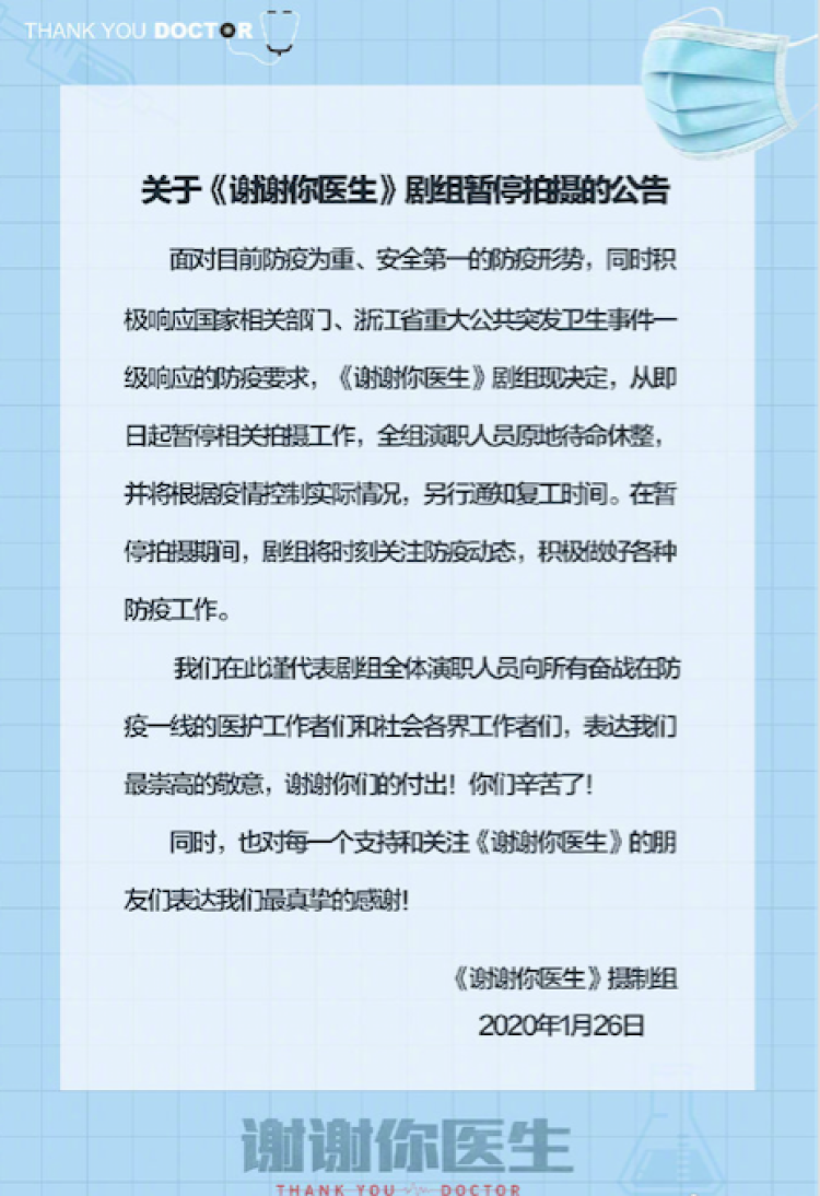 随着《大江大河2》、《有翡》和《谢谢你医生》这三部热门大剧均宣布停拍,相信越来越多正在拍摄中的新剧都会根据相应情况调整。