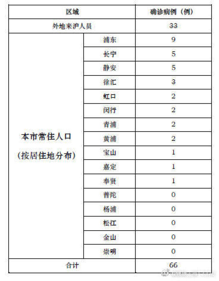 累计确诊病例中,27例有湖北居住史、23例有湖北旅行史、16例有相关确诊病例接触史;外地来沪人员33例,本市常住人口33例,具体分布情况如下图,详↓