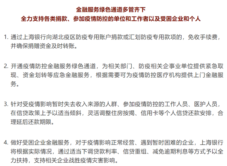 同时,上海银行开辟多条绿色通道全力支持相关单位和个人,聚焦重点领域为疫情防控提供优质高效的综合金融服务。