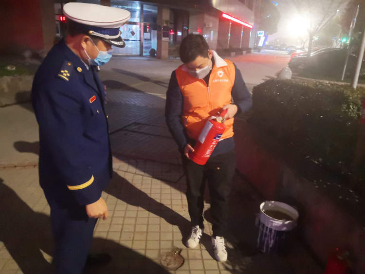 ▲消防执法人员联合平安志愿者开展流动巡逻