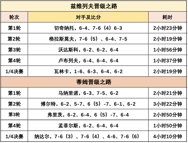 兹维列夫胜,1赔2.50;蒂姆胜,1赔1.53。博彩公司更为看好蒂姆晋级决赛。