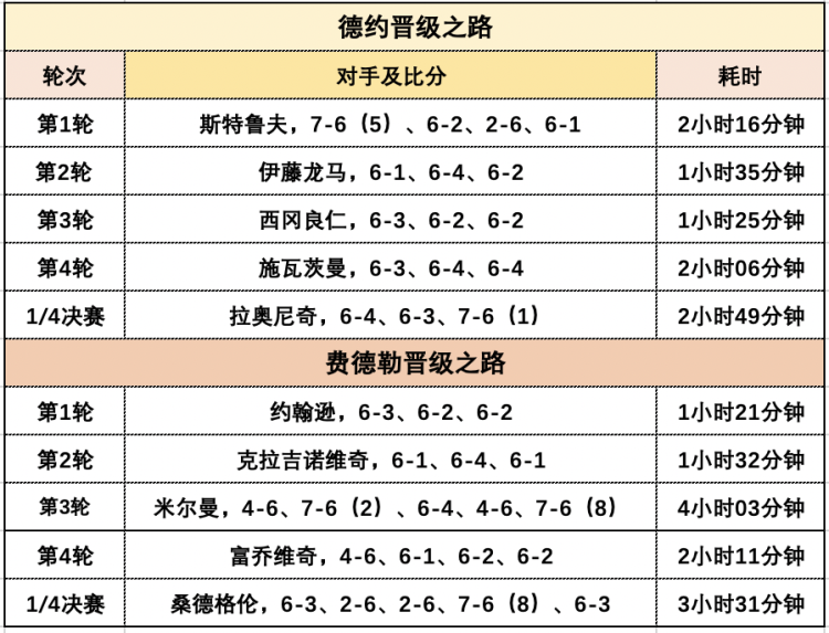 值得注意的是,自2015年至今两人共有13次交手,德约赢得其中的9次,费德勒则是4次取胜。