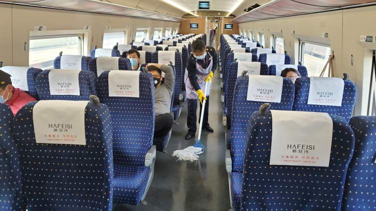 车开后没多久,有专门的清洁人员在车厢内拖地,空气中有84消毒液的味道,待清洁人员离去后,消毒液的味道又很快散去。