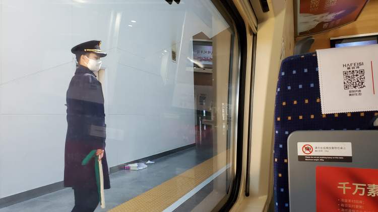 一名列车员带着笔记本走过来,记者上前询问车厢内是否测温,列车员表示如有身体觉得不舒服,工作人员会马上进行测温。