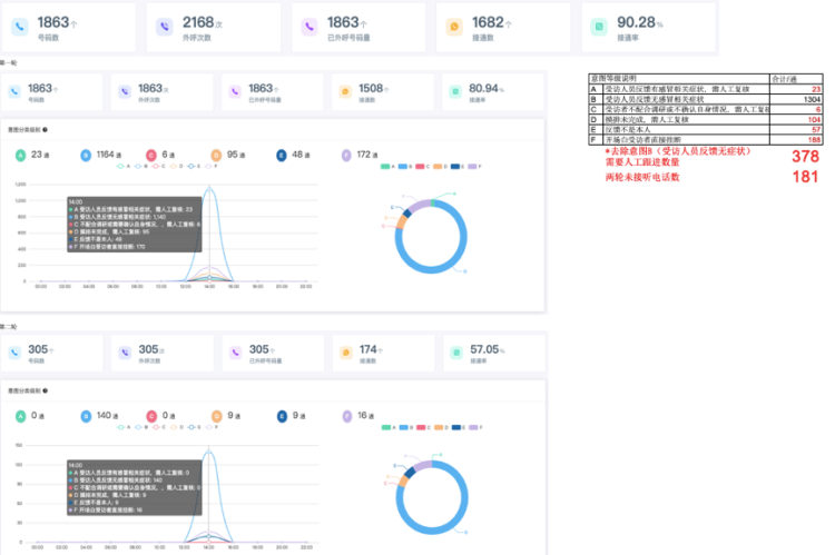以基层街道社区为例,工作人员每天八小时拨打电话的上限在200-300通左右,由于问题的重复繁杂,造成工作人员疲劳烦躁,也不能完全保障排查工作的准确性。应用“疫情防控机器人”代替人力,则实现批量一对一电话呼叫,可大大减轻街道社区工作人员的负担。