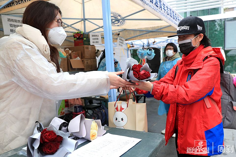 中午12:40,在铁路上海站完成早班值守的青年志愿者们惊喜地收到一束玫瑰花和小礼物。这份特殊礼物是静安区青年志愿者协会为每一位在上海站防控工作第一线的志愿者准备的,以表对他们的敬意。