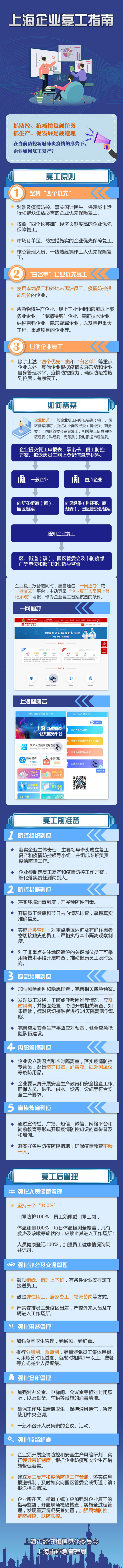 上海企业复工指南发布!一图看懂复工前后需要做什么 周到君 2020-2-14 来源:周到上海 抓防控、抗疫情是硬任务,抓生产、促发展是硬道理! 在当前防控新冠肺炎疫情的形势下,企业如何复工复产,如何进行备案,复工前需要做好哪些准备,复工后如何管理,一起来看看吧↓↓↓ 来源:周到上海 作者:周到君 赞一个 (0)