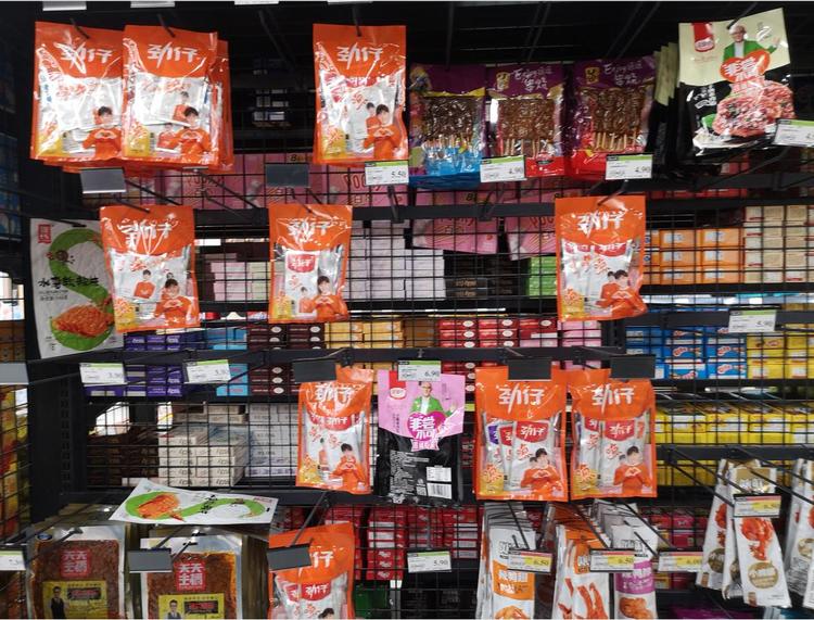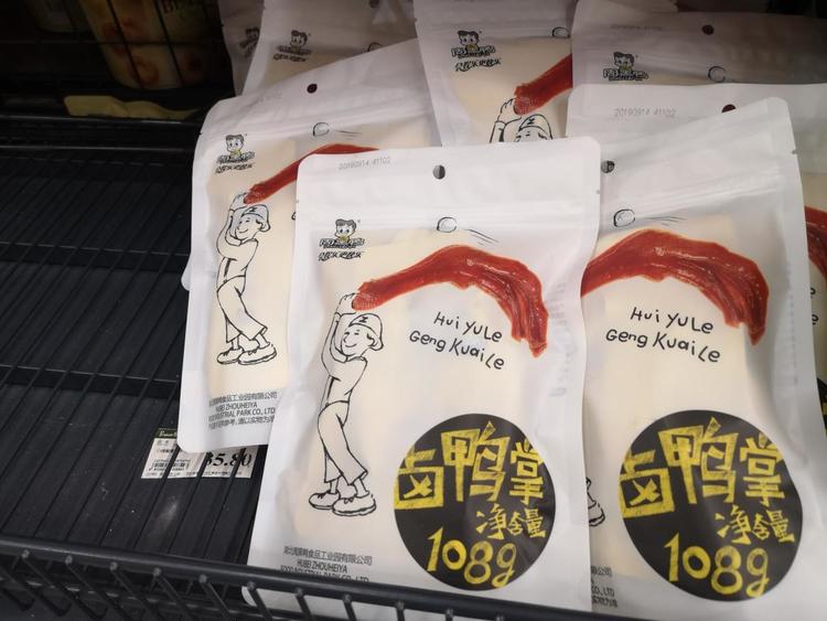 卤味里的王者当属于周黑鸭,鸭脖和鸭翅都卖得很好:
