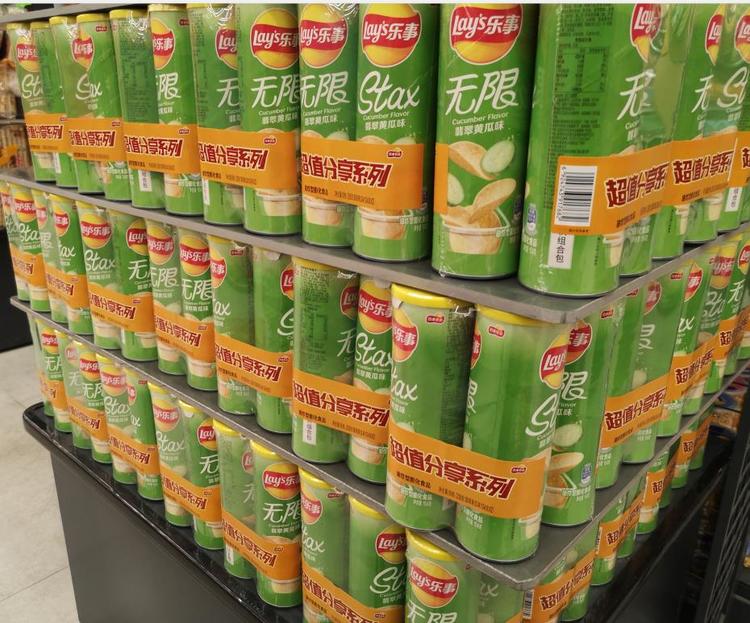 与此同时,235g袋装黄瓜味薯片就摆满货架(明明更便宜):