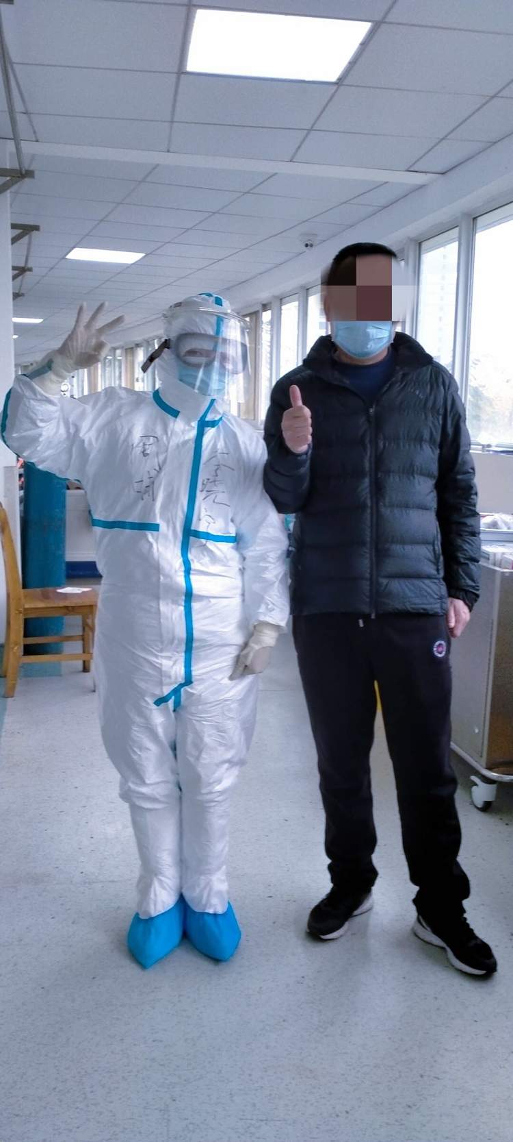 今天也有好消息。我们重症病房的第一例患者今天出院了。之前我们的病人好转后都是转到轻病房,统计时不算在我们病区出院。驰援武汉20多天来,我们第一次感受到患者出院的喜悦:当看到病人举起大拇指,欣喜若狂的我们感觉所有的付出都是值得的。