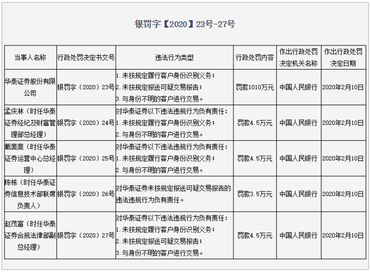 央行银罚字【2020】23号-27号显示(见下图),华泰证券因未按规定履行客户身份识别义务、未按规定报送可疑交易报告、与身份不明的客户进行交易,被央行合计罚款1010万元。