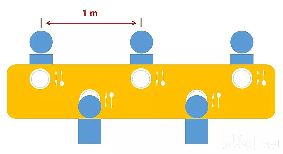 一、在公共餐饮场所饮食时,人与人之间距离保持一米左右。同排的隔位相坐,对面的错位相坐,避免面对面饮食。