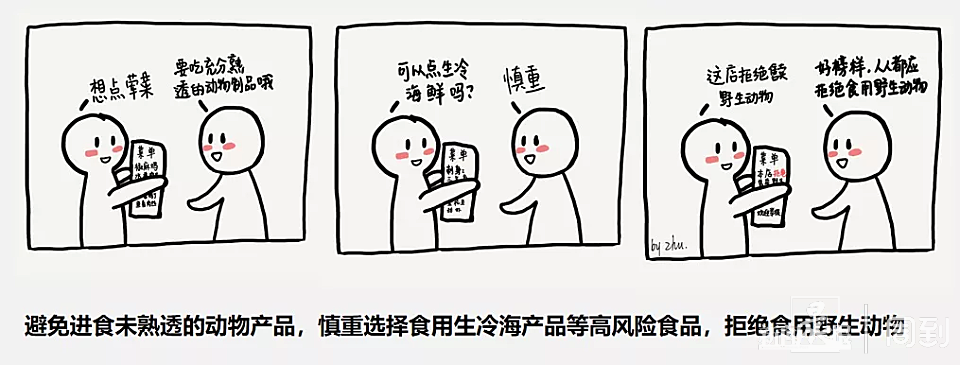 七、避免进食未熟透的动物产品,慎重选用生冷海产品等高风险食品,拒绝食用野生动物。