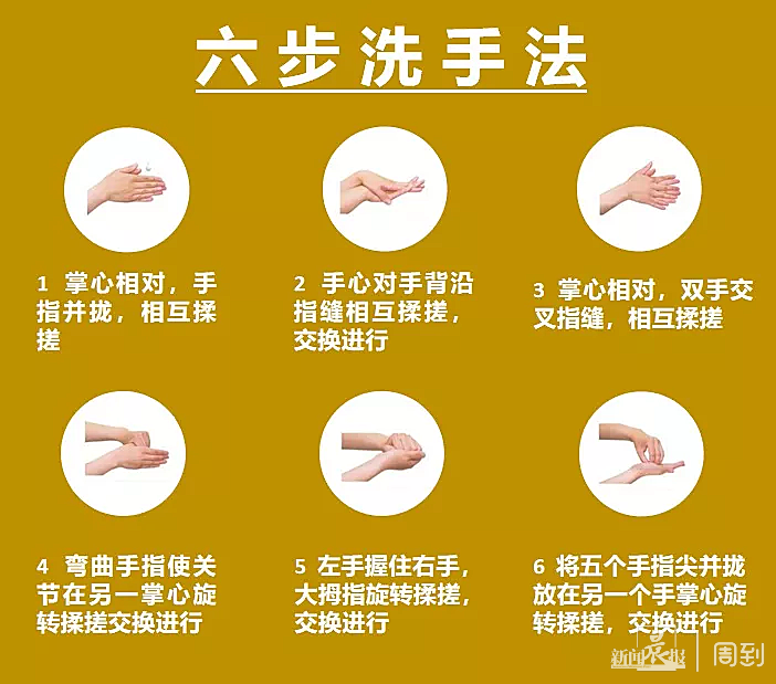 四、坚持在用饮食前后、咳嗽或打喷嚏后,按照“六步法”严格洗手。洗手间、洗手池配备足够的洗手液,保证水龙头等供水设施正常工作。