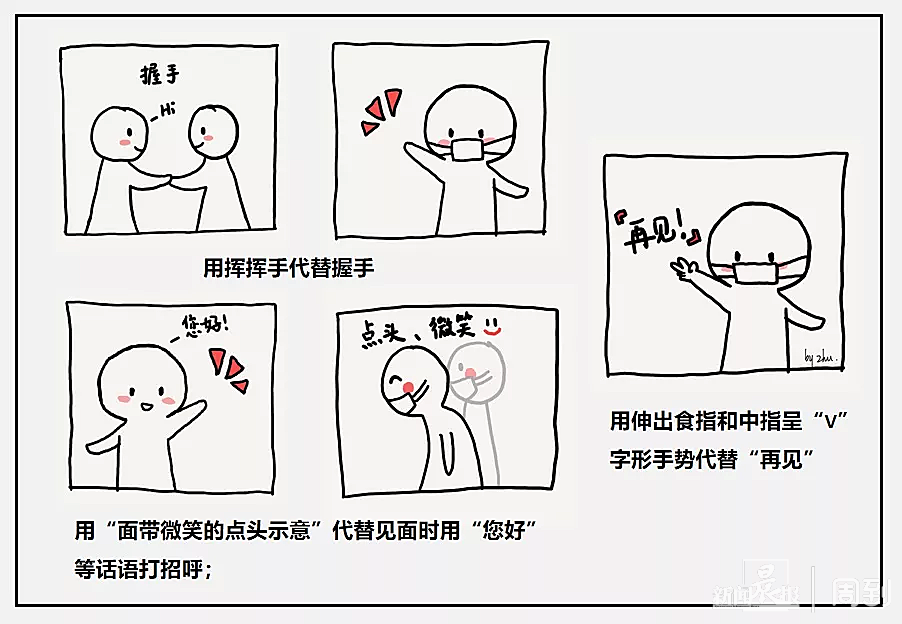 五、在公共餐饮场所,建议使用肢体语言交流,避免在饮食见面时说话。建议用“面带微笑的点头示意”代替见面时用“您好”等话语打招呼;用挥挥手代替握手;用伸出食指和中指呈“V”字形手势代替“再见”,同时寓意将战胜疫情。