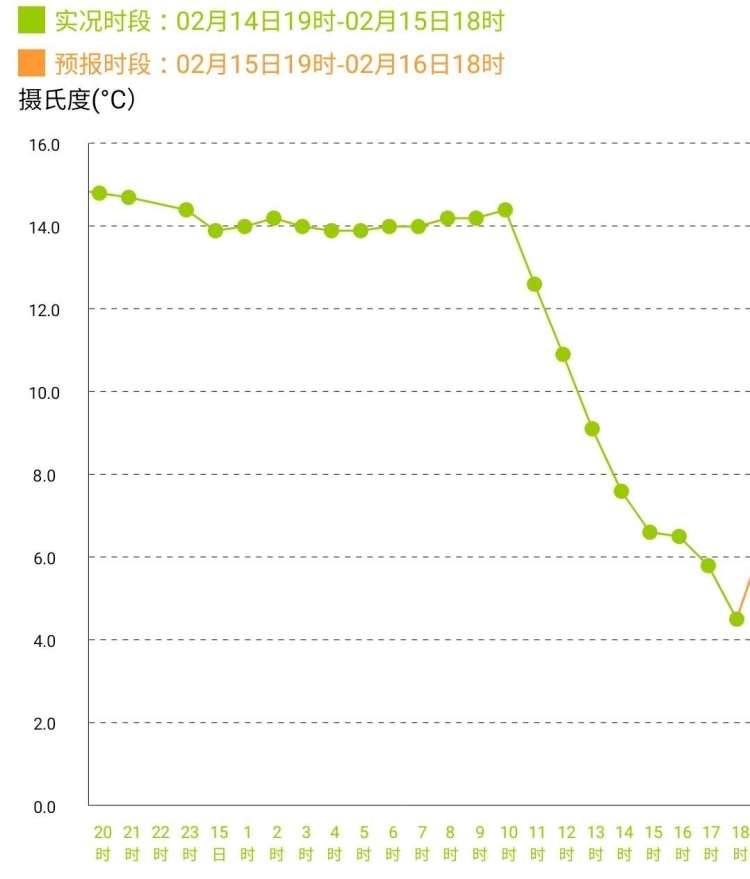 从气温走势图上可见,今天上午10时左右,申城的气温从14℃多的位置俯冲而下,到了18时仅剩4℃多,8小时内降温了10℃左右,降温折线如刀劈斧砍,一个猛子从山坡扎向了山谷。