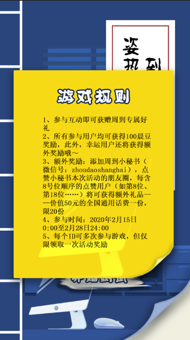 作为最爱给用户发福利的周到君,周到君这里要大声提醒你:答题后不要走开!还有众多福利等着你来拿!所有参与本次活动的用户均可获得100晨豆(可用于周到商城兑换礼品)!