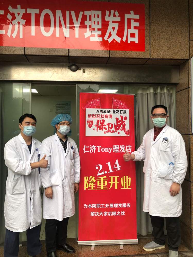2月11日晚,仁济医院接上级紧急通知需要10小时内紧急集结一支医疗队支援某医院,在院内开设一家理发店的计划初具雏形。三天时间“仁济Tony理发店正式开张”。