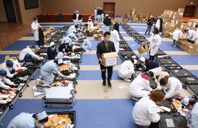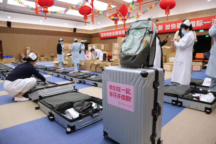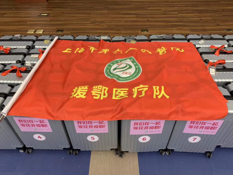 在第六人民医院,每个行李箱上都贴着这句话。接到援鄂任务后,统一的行囊开始准备,昨天一整夜,50个箱子一排排摊开,物品一件件放。