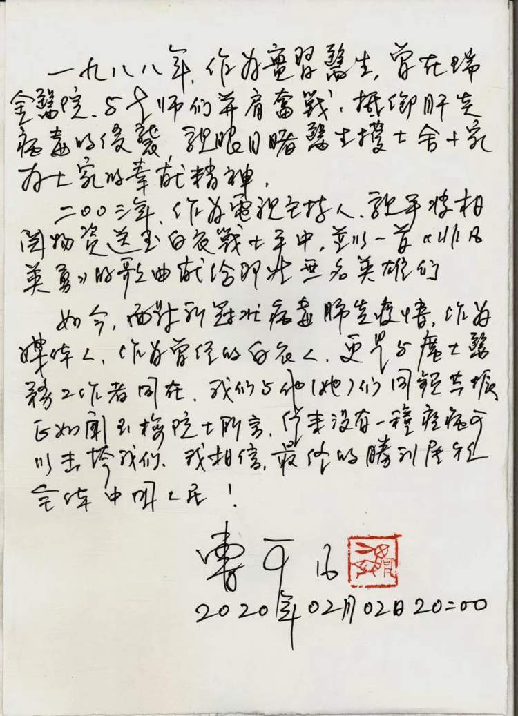 此前葛均波院士“写给全体学生的一封信”,刷屏社交媒体。信中写道:“同学们,这次新冠病毒疫情还没有看到被控制的迹象,老师报名了第二批支援湖北医疗队,没有被批准。昨晚我又报名第三批医疗队出征,等待批准……”被网友们称为“请战院士”。神经生物学家、中国科学院院士杨雄里收到邀约时身处海外,他不顾长途飞行后的劳顿,立即提笔写道:“痛定思痛,我们也必须举一反三,深刻反省……恩格斯说:藐视辩证法是不能不受到惩罚的。言之信然。”