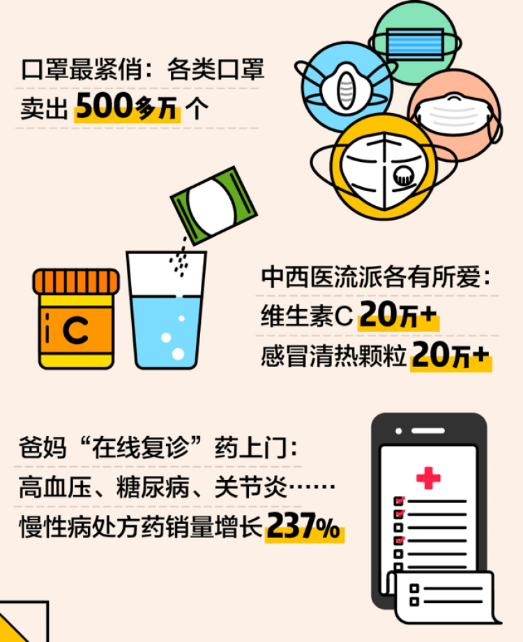 《大数据》显示,春节期间,人们通过美团外卖买走了500多万个口罩,而为了保持健康、增加免疫力,各类维生素C销量近20万,感冒清热类的中成药也售出了20多万。