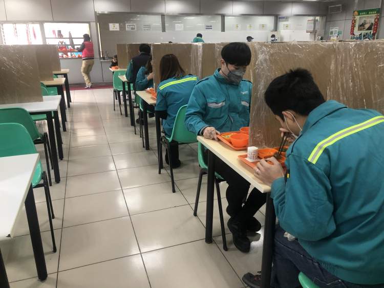 只听防疫员问道:“现在空调还开着吗?”“不开了。几个应急通道的大门都大开着,保证车间空气流通。”生产安全部经理樊青回答,“除此之外,我们还在食堂的餐桌上设置了个隔离板,让员工可以安全就餐。”