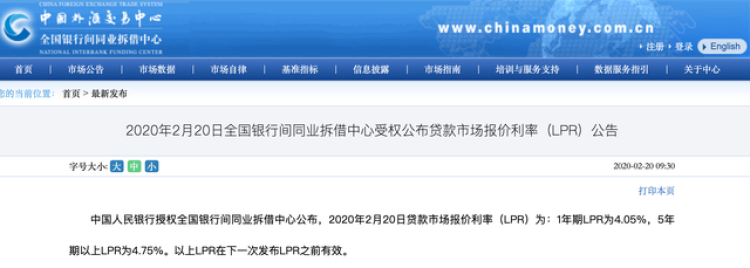 今天,中国人民银行授权全国银行间同业拆借中心公布,2020年2月20日贷款市场报价利率(LPR)为:1年期LPR为4.05%,5年期以上LPR为4.75%。以上LPR在下一次发布LPR之前有效。根据央行数据,上次1年期LPR为4.15%,5年期以上LPR为4.80%。