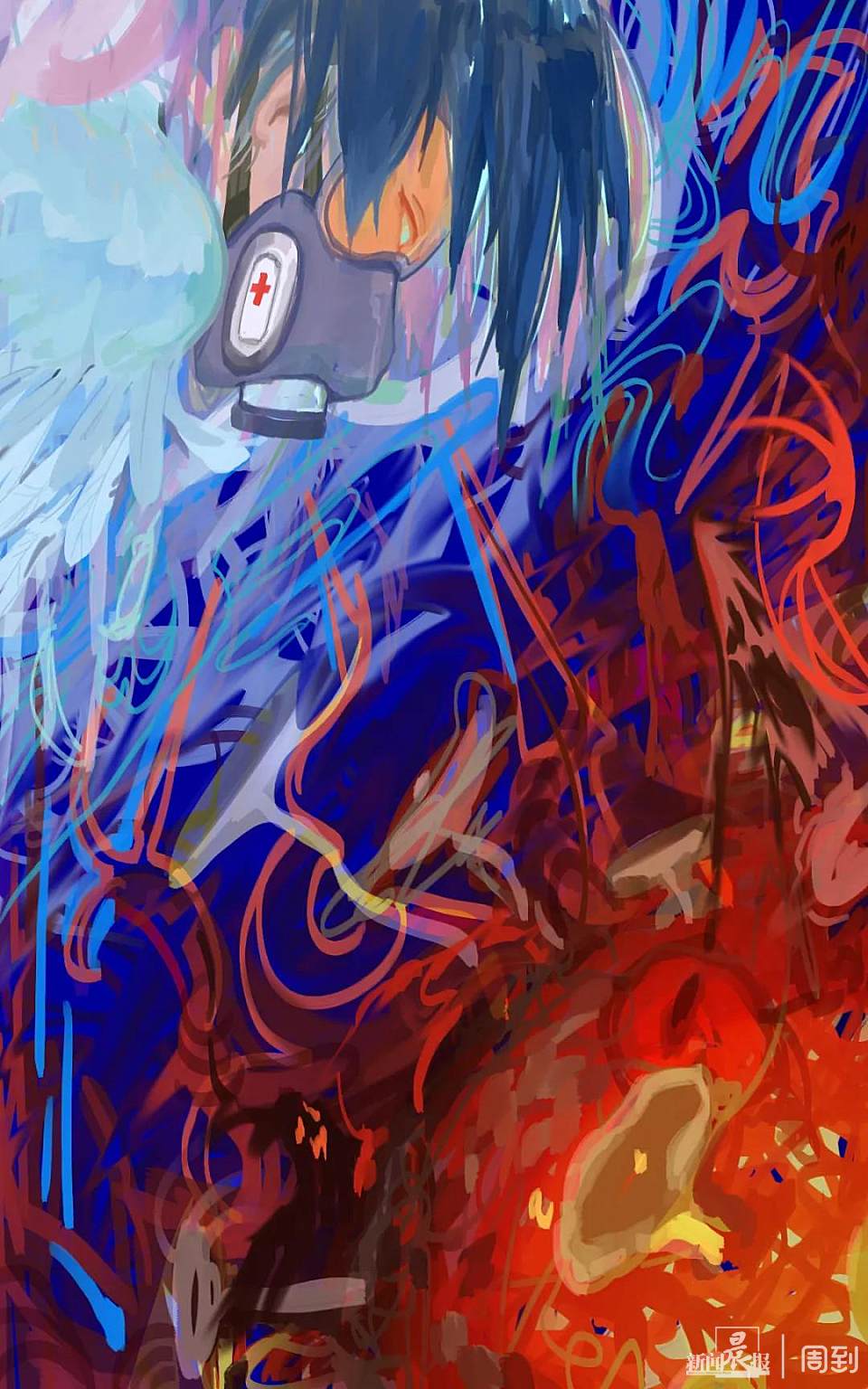 用红蓝对比色显出医生与冠状病毒的对峙,将医生的衣服用羽毛修饰表达生命之羽,并用曲线刻画周边线条表达生命感。另一半用红色的尖锐线条表达病毒的危险与压迫感。