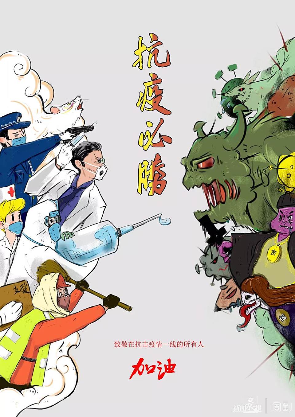 设计介绍:以对抗的形式,一线抗疫的英雄们对抗病毒和社会的毒瘤作画,通过插画向一线抗疫人员致敬,激励人们,战胜疫情。