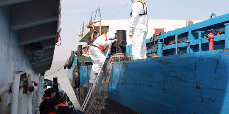 “三马666”抛锚隔离的14天内,长江航运公安局上海分局定时开展水域巡逻,协同宝山区卫健委等部门对船员进行体温记录、防疫消毒指导等工作,全力保障“三马666”船舶隔离观察期。